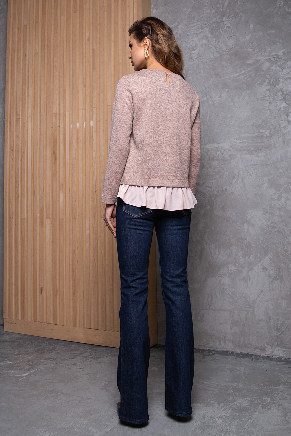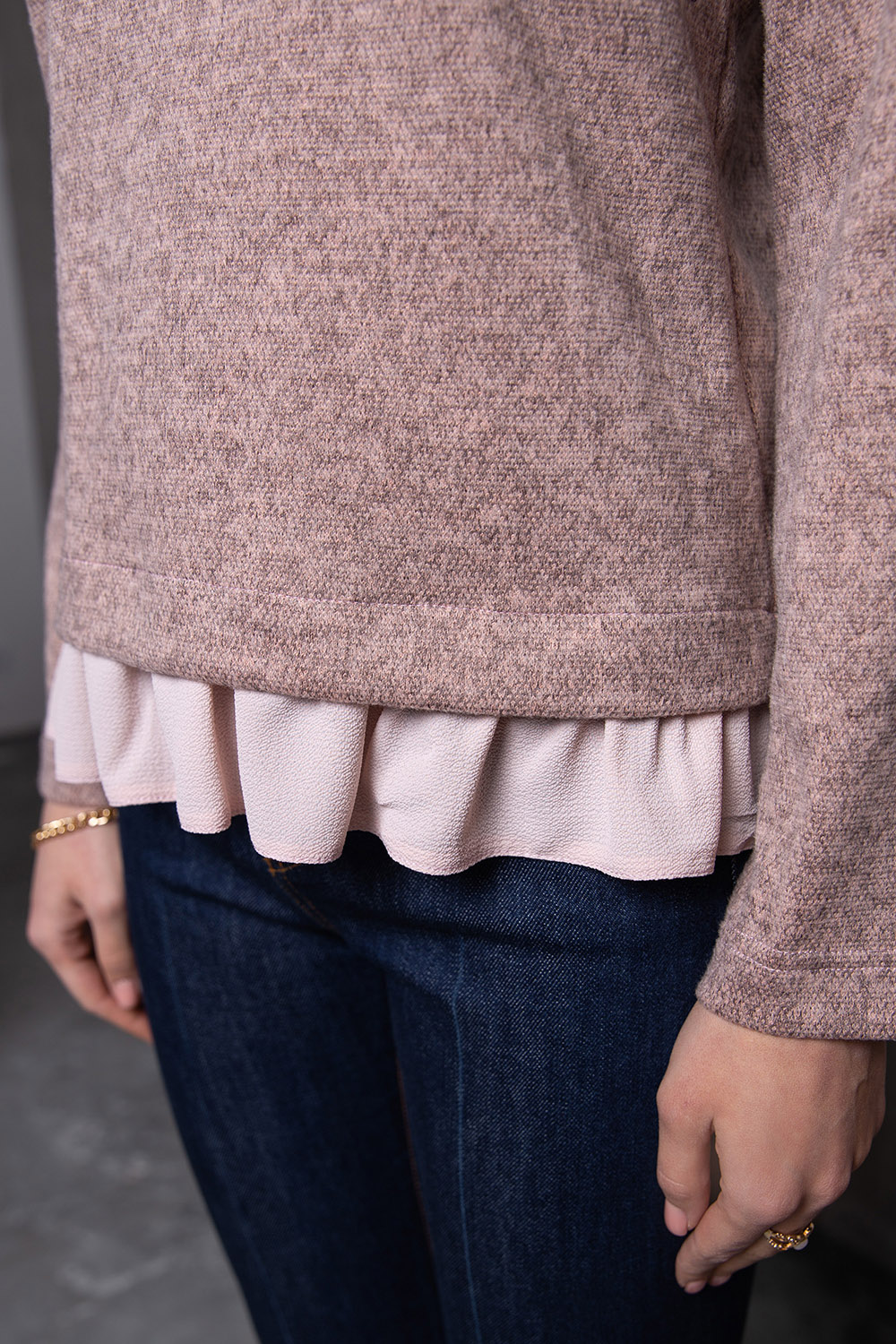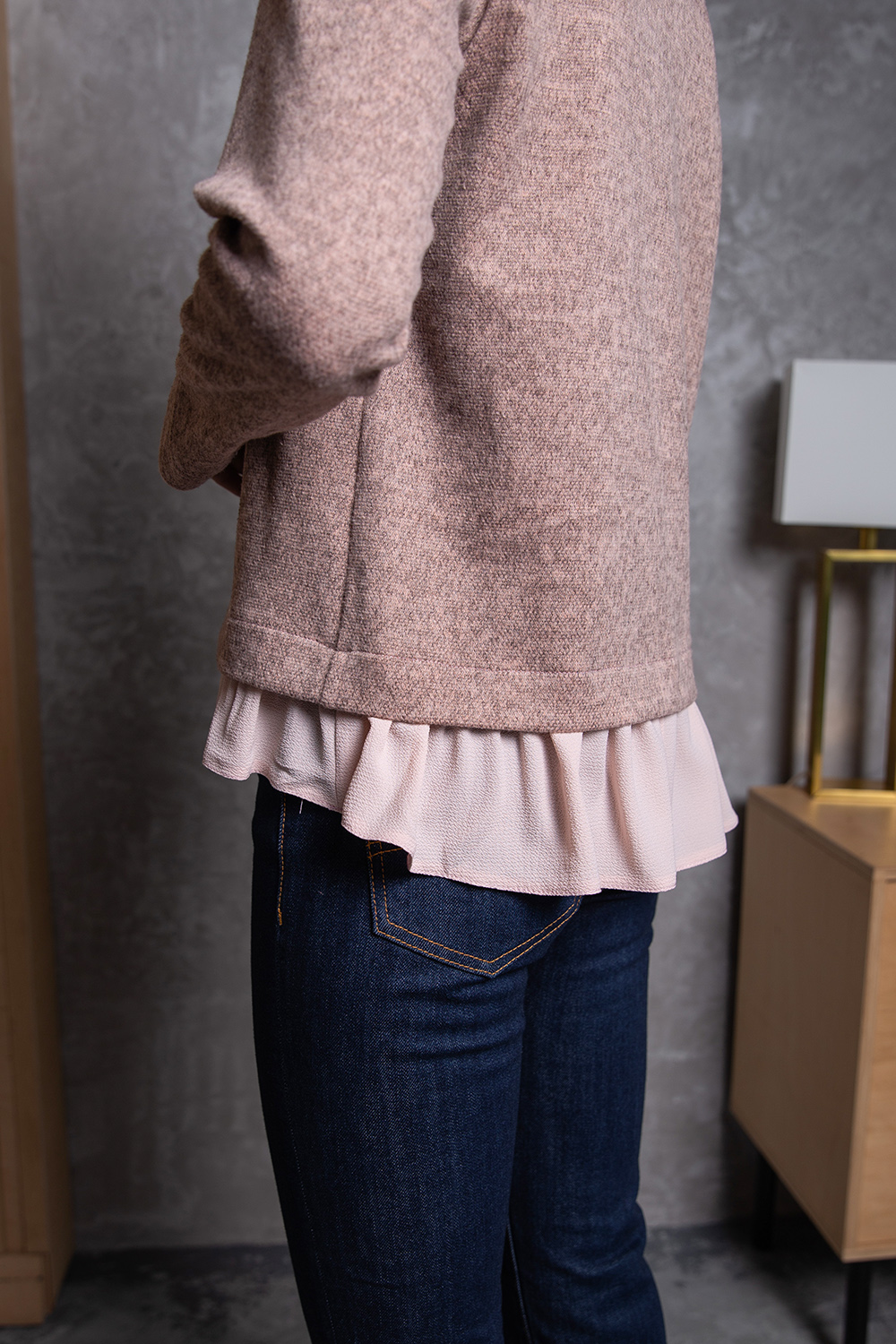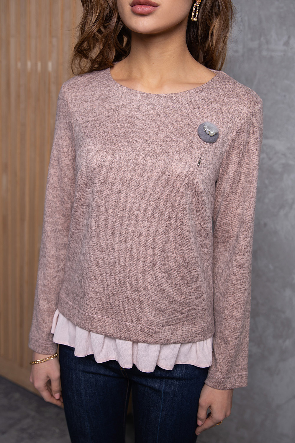 Блузка из трикотажного меланжевого полотна. Низ блузки декорирован притачным воланом со сборкой из полупрозрачного шифона. Перед с нагрудными вытачками, декорирован съемной брошью. Спинка со средним швом и вырезом капелькой у горловины, рукав втачной. Вырез горловины округлый. Низ изделия асимметричный.