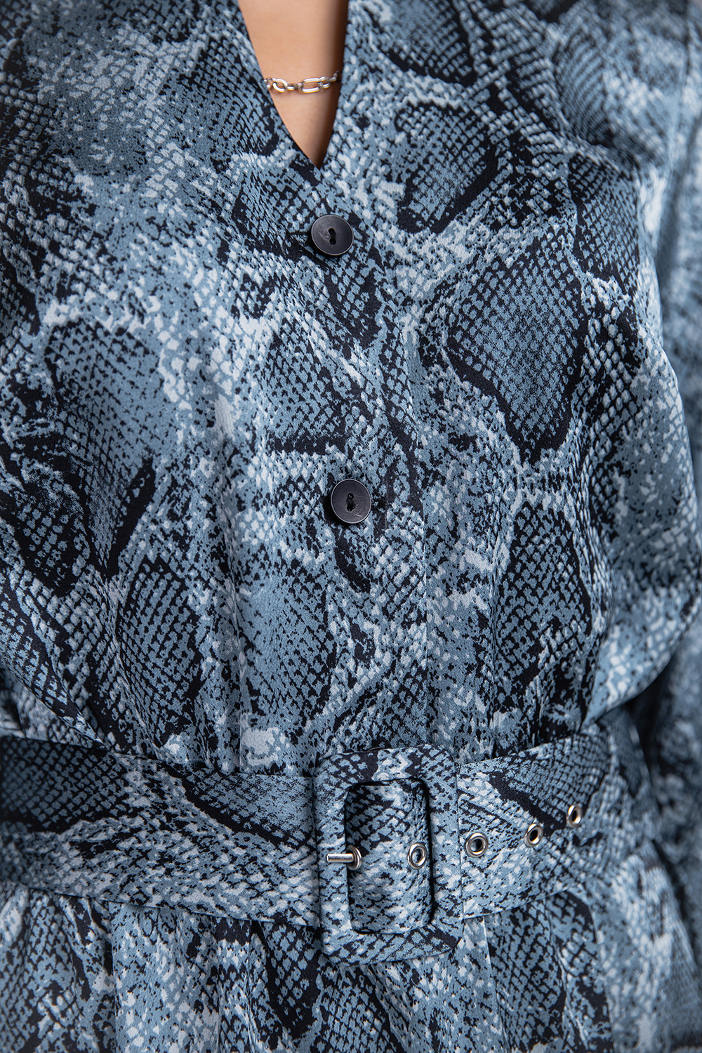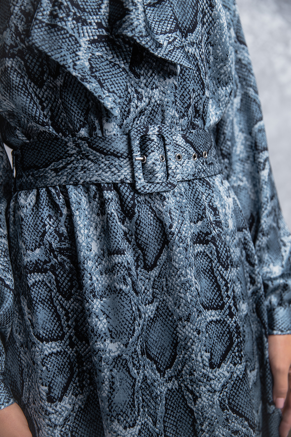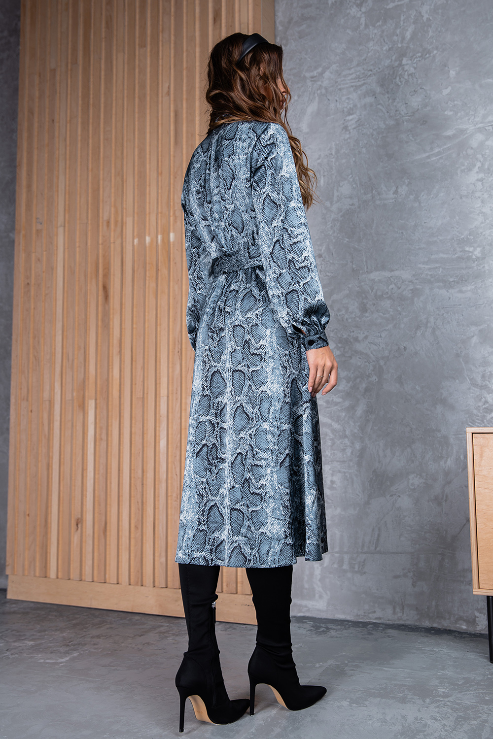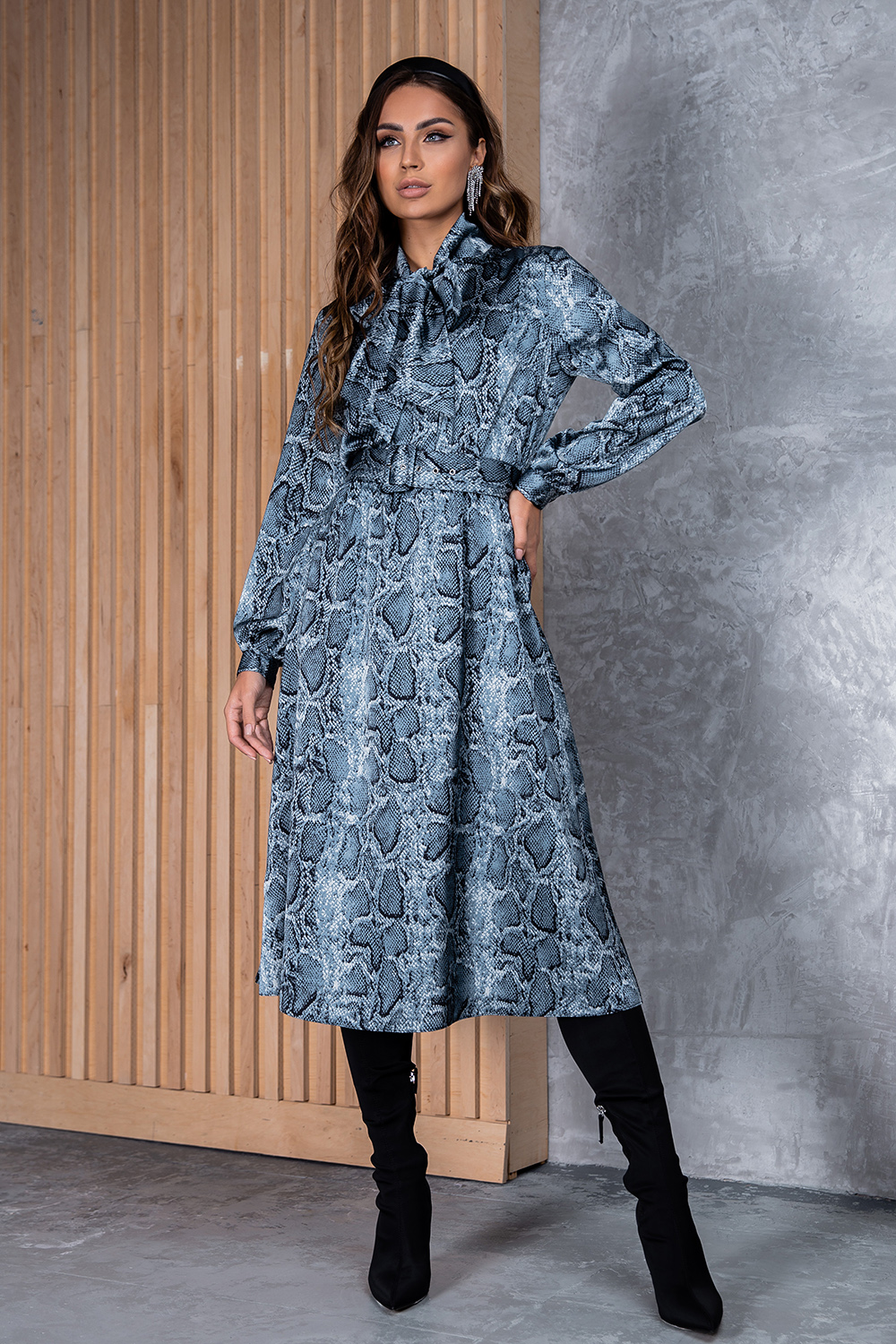 Платье-миди Х-силуэта. Отрезное по талии. Рукав втачной, длинный, с манжетами. Горловина - бант-стойка. Силуэт полуприлегающий.